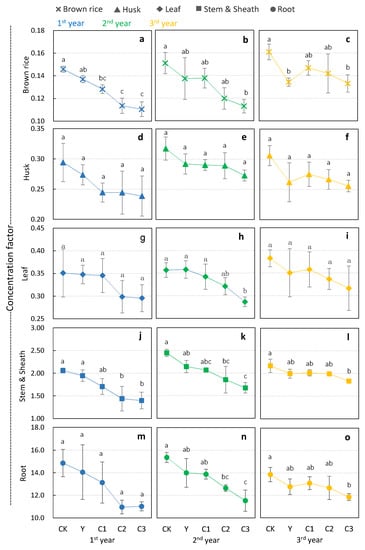 The concentration factors of Cd in rice organs (Brown rice: (a–c), Husk: (d–f), Leaf: (g–i), Stem and sheath: (j–l), Root: (m–o)) with biochar treatments in three years. The error bars indicate standard deviations (n = 3). The different letters on bars indicate significant differences (p < 0.05) between the biochar treatments. CK: control, Y: yearly 3 t ha−1, C1: 7.5 t ha−1, C2: 15 t ha−1, and C3: 30 t ha−1.