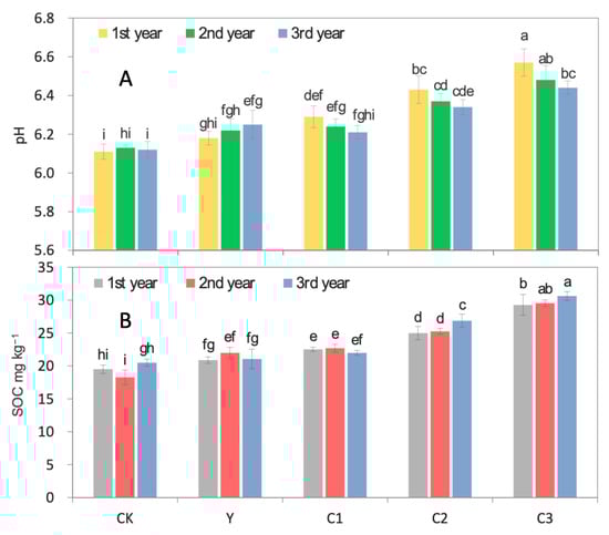 The soil pH (A) and SOC (B) of different treatments in three years (mean ± S.D., n = 3). The different letters on bars indicate significant differences (p < 0.05) between the biochar treatments. CK: control, Y: yearly 3 t ha−1, C1: 7.5 t ha−1, C2: 15 t ha−1, and C3: 30 t ha−1.