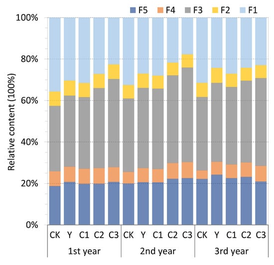 As shown in Table 4, C1, C2, and C3 all significantly decreased F1 content in three years, and the Y treatment also decreased in the last two years. Biochar treatments had no significant effect on the Cd content of F2. C3, C2, and C1 were able to significantly increase the F3 content in different years. C3 increased F4 content significantly in three years, while the other biochar treatments only increased F4 in the third year. C2 and C3 increased F5 content in the second year.