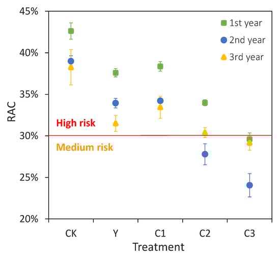 The RAC values for Cd with biochar treatments in three years (mean ± S.D., n = 3). Red dashed line in the figure is a dividing line that represents a critical value (30%) for high-risk and medium-risk. CK: control, Y: yearly 3 t ha−1, C1: 7.5 t ha−1, C2: 15 t ha−1, and C3: 30 t ha−1.