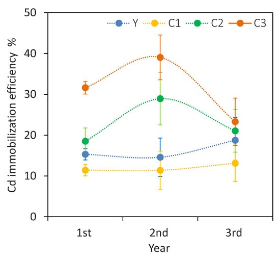 The Cd immobilization efficiency of different treatments in three years (mean ± S.D., n = 3). CK: control, Y: yearly 3 t ha−1, C1: 7.5 t ha−1, C2: 15 t ha−1, and C3: 30 t ha−1.
