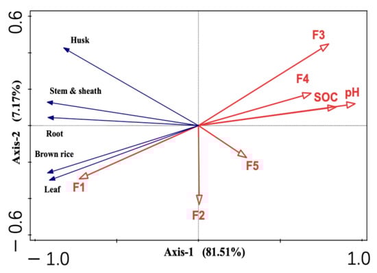 The first two axes of RDA explain the variance between the Cd contents in rice and the soil environmental factors in Figure 8, which are 81.51% and 7.1%, respectively. The length of the red arrow indicates the influence of soil factors on the Cd contents in rice, and its direction is related to the coordinate axis. As shown in Figure 8, F1 is positively correlated with all Cd contents in rice organs; F2 is positively correlated with the Cd contents in leaf and brown rice, but negatively correlated with Cd contents in other organs; and the pH, SOC, F3, F4, and F5 are negatively correlated with all Cd contents in rice organs. The selected environmental variables could account for the 93.5% variation of Cd contents in rice. The Cd contents variation explained by soil environmental factors is reduced as follows: pH > F3 > F5 > F4 > F2 > F1 > SOC. RDA confirmed that the soil pH (F = 38.9, p = 0.002) and Cd content of F3 (F = 4.6, p = 0.008) in soil were the most important contributors to the variation in Cd content in rice plants and accounted for 80.2% and 7.4% of the variation, respectively.