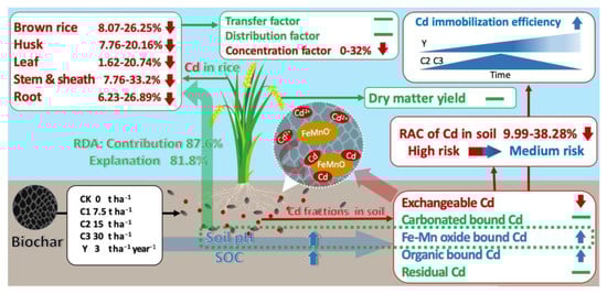 As noted above (Figure 5, Figure 7), the formation of Fe-Mn oxide bound Cd is closely related to the change in soil pH [], and the increase in pH inhibited the reduction and dissolution of iron oxides, and increased the quantity of negative charges on the soil colloid surface, which could enhance the adsorption of Cd in soil []. The increasing of soil pH and Fe-Mn oxide bound Cd caused by biochar application is the main explanation for the redistribution of Cd in soil, which then caused a series of influences, such as reducing Cd uptake in rice and reducing the risk of Cd in soil. Based on the above results (Figure 9), some hypotheses of cost-saving and synergic biochar application can be put forward. For instance, (i) the application of small amounts of biochar per year or large amounts every other year can reduce costs while maintaining high soil pH and increasing the immobilization efficiency for soil Cd, (ii) the use of Fe-modified biochar or a mixture of Fe oxide and biochar can further improve Cd immobilization in soil, and (iii) the use of biochar together with physiological regulating substances such as Si, or the use of biochar in the cultivation of rice with Cd resistance genes, can further reduce rice Cd uptake. However, these hypotheses needed to be further explored. In addition, there is a deficiency that needs to be pointed out: the current study does not provide detailed analysis of soil properties other than pH and SOC, such as soil nutrients after 3 years, etc.