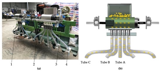 The schematic diagram of direct seeder and distributed seed-drop tubes; (a) main structure of rice-direct seeder. 1. seed metering device 2. gasoline engine 3. centrifugal fan 4. riding rice transplanter head; (b) seed metering device with distributed seed-drop tubes.
