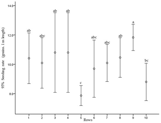 The seeding rate error bar chart. Vertical bars above mean values indicate standard error. Different letters indicate significant difference according to the LSD (0.05) test.