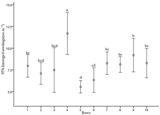 The error bar chart for emerged seedings. Vertical bars above mean values indicate standard error. Different letters indicate significant difference according to the LSD (0.05) test.