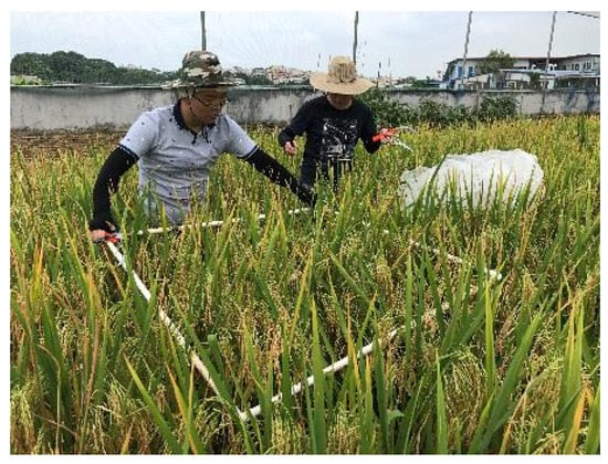 The plot establishment in the paddy field at sowing stage (a) seeding in paddy field; (b) the sampling plot establishment.