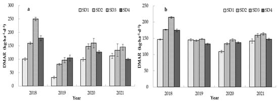 DMAR of different sowing dates from 2018 to 2021. (a) J–H stage, (b) H–M stage.