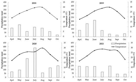 The monthly precipitation and temperature of the rice growing stage from 2018 to 2021 were shown in Figure 2. In the four years, July and August were the hottest months, which were the stage of heat stress in rice. Late September and October were the stages of low temperature after flowering. The total precipitation of the rice growing stage in 2018, 2019 and 2021 was 652.9 mm, 647.2 mm, and 712.0 mm, respectively, but in 2020, it was 70% higher than the average of the other three years, reached 1141.6 mm. The variation in monthly precipitation was relatively large too. Generally, there was more precipitation in the early stage of rice growth (April–July), and less in the later stage (August–October). But in 2020, the monthly precipitation in September and October were still very high, occurred an autumn flood.