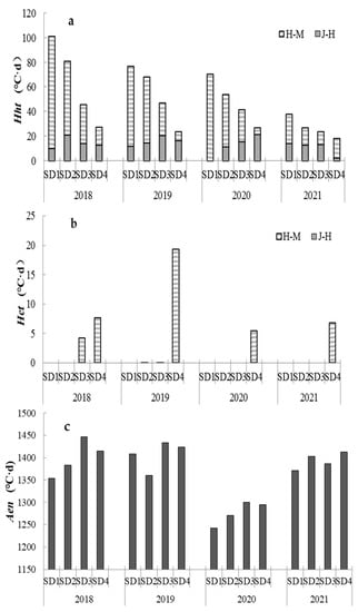 The Aen that removing Hht and Hct can objectively evaluate the thermal resource during rice growth. In Figure 3c, it was shown that, appropriately delaying the sowing date increased the thermal resource of rice growth, especially the beneficial portion of the heat that promotes rice growth. Among them, The Aen of SD4 was the highest, followed by SD4.