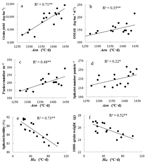 Relationship between Aen and grain yield (a), DMAR (b), panicle number (c) and spikelet number (d), and the relationship between Hht and spikelet fertility (e) and 1000–grain weight (f) in different sowing dates from 2018 to 2021. * and ** indicate significance of the difference at p < 0.05 and p < 0.01, respectively. R2 represents the determination coefficient of this regression equation.