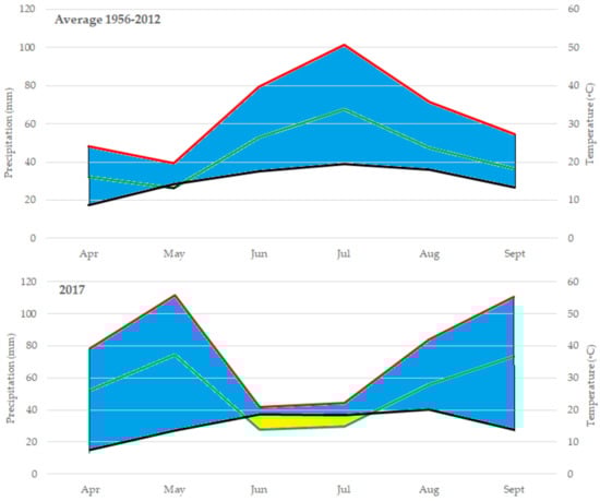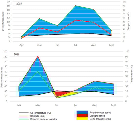 Climate graphs according to Walter [] characterizing weather conditions in Przecław, Poland, during the soybean growing season in 2017–2019.