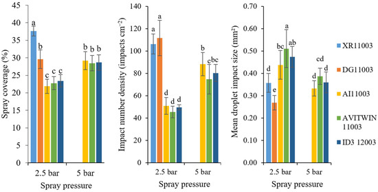 Spray coverage, impact number density and mean droplet impact size (mean ± SD) for the 8 tested nozzle type-pressure combinations all at 200 L ha−1. Means without a common letter are significantly different (p < 0.05) according to the Tukey test.