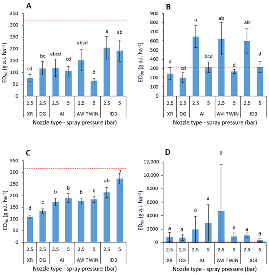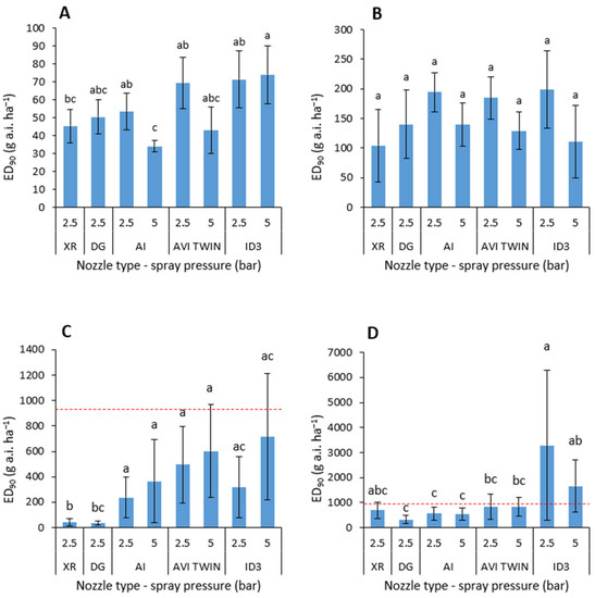 ED90 responses (with standard errors) of cotyledon and 2-leaf stage plants of C. album and S. nigrum to bentazon applied with various nozzle type-pressure combinations: (A) C. album at BBCH10, (B) C. album at BBCH12, (C) S. nigrum at BBCH10 and (D) S. nigrum at BBCH12. Nozzle types used are standard flat-fan (XR), pre-orifice flat-fan (DG), air induction flat-fan (AI, ID3) and air induction dual flat-fan (AVI TWIN). No significant differences (p < 0.05) between bars with the same letter (based on computed selectivity indices and corresponding p-values). The red dotted line represents maximum authorised field dose.
