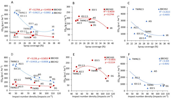 Quadratic relations between the ED90 values and spray coverage and between the ED90 values and impact number density are provided for each species-stage combination in Figure 5 (phenmedipham) and Figure 6 (bentazon). Model parameters are provided in Table S2. Relations between the ED90 responses and the mean droplet impact size are not shown as the determination coefficients were rather low, namely 0.22, 0.81, 0.14 and 0.45 for phenmedipham and 0.37, 0.65, 0.21 and 0.23 for bentazon, for C. album BBCH10 and BBCH12 and S. nigrum BBCH10 and BBCH12, respectively. Overall, ED90 responses decreased with increasing spray coverage and impact number density. Unfortunately, due to poor determination coefficients, no critical threshold for a bio-efficient herbicide application could be defined based on spray coverage characteristics, irrespective of combination of herbicide, species and growth stage, except for 2-leaf stage plants of C. album treated with phenmedipham for which spray coverage and impact number density should be minimally 28.8% (Figure 5A) and 81.2 (Figure 5D) (average of all air induction nozzles at 5 bar). Nozzle-pressure combinations equalling or exceeding these thresholds performed equally well as a XR standard flat-fan nozzles at 2.5 bar, indeed.