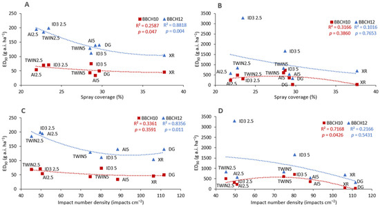 The following supporting information can be downloaded at: https://www.mdpi.com/article/10.3390/agronomy13051342/s1, Table S1: Volume- and number-based droplet characteristics (mean ± SD) for all tested nozzle type-pressure combinations. Dmin, Dmax: minimum and maximum droplet diameter (µm); Dv0.1, Dv0.5 and Dv0.9: droplet diameter (µm) at which 10, 50 and 90% of the spray volume is contained in droplets at or below that diameter; Dv0.5 = VMD (‘Volume Median Diameter’); V150: percentage (%) of the spray volume contained in droplets with a diameter <150 µm; vavg: average droplet velocity (m s−1), RSF: ‘Relative span factor, i.e.,’ a measure of uniformity of droplet sizes in a spray, calculated as [(Dv0.9 − Dv0.1)/Dv0.5]; Dn0.1, Dn0.5 and Dn0.9: droplet diameter (µm) at which 10, 50 and 90 percent of the droplets have a diameter at or below that diameter; Dn0.5 = NMD (‘Number Median Diameter’). N150: percentage (%) of droplets smaller than 150 µm. Table S2: Model parameters and determination coefficients (R²) of quadratic regressions y = a * x² + b * x + c between ED90 and spray coverage characteristics for all factorial combinations of herbicide, species and growth stage. Table S3: Model parameters and determination coefficients (R²) of quadratic regressions y = a * x² + b * x + c between ED90 and droplet characteristics for all factorial combinations of herbicide, species and growth stage. VMD: volume median diameter. Dn0.9: droplet diameter (µm) at which 90% of the droplets have a diameter at or below that diameter. V150: percentage (%) of the spray volume contained in droplets with a diameter <150 µm. Figure S1: Spray distribution (mean flow rate ± standard deviation) of a single nozzle at a given spray pressure, off set angle (7°) and height (50 cm) for 8 nozzle–pressure combinations: (A) standard flat-fan Teejet XR 110 03 at 2.5 bar, (B) pre-orifice flat-fan Teejet DG 110 03 at 2.5 bar (DG), (C) air induction flat-fan Teejet AI 110 03 at 2.5 bar, (D) air induction flat-fan Teejet AI 110 03 at 5 bar, (E) air induction dual flat-fan Albuz AVITWIN 110 03 at 2.5 bar, (F) air induction dual flat-fan Albuz AVITWIN 110 03 at 5 bar, (G) air induction flat-fan Lechler ID3 120 03 at 2.5 bar and (H) air induction flat-fan Lechler ID3 120 03 at 5 bar. Numbers on the X-axis depict groove numbers of the spray distribution bench (ISO 5682-1); each collector groove (i.e., one bar) is 5 cm wide; grooves −1 and 1 (gray bars) delineate the central 10-cm zone beneath the nozzle.
