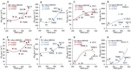 Quadratic regressions (with R²-values) between the volume median diameter (VMD) and the ED90-responses of 2 growth stages (BBCH10, BBCH12) of C. album (A,B,E,F) and S. nigrum (C,D,G,H) treated with phenmedipham (A–D) and bentazon (E–H) using various nozzle type-spray pressure combinations. Nozzle types used are standard flat-fan at 2.5 bar (XR), pre-orifice flat-fan at 2.5 bar (DG), air induction flat-fan at 2.5 and 5 bar (AI2.5, AI5, ID3 2.5, ID3 5) and air induction dual flat-fan at 2.5 and 5 bar (TWIN2.5, TWIN5). Model parameters are provided in Table S3.