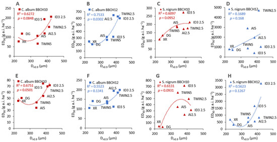 Quadratic regressions (with R²-values) between the droplet diameter at which 90 percent of the droplets are smaller than that diameter (Dn0.9) and the ED90-responses of 2 growth stages (BBCH10, BBCH12) of C. album (A,B,E,F) and S. nigrum (C,D,G,H) treated with phenmedipham (A–D) and bentazon (E–H) using various nozzle type-spray pressure combinations. Nozzle types used are standard flat-fan at 2.5 bar (XR), pre-orifice flat-fan at 2.5 bar (DG), air induction flat-fan at 2.5 and 5 bar (AI2.5, AI5, ID3 2.5, ID3 5) and air induction dual flat-fan at 2.5 and 5 bar (TWIN2.5, TWIN5). Model parameters are provided in Table S3.