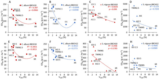 Volume median diameter (Figure 7, Table S3) and Dn0.9 (Figure 8, Table S3) were strongly associated (R² > 0.5) with ED90, irrespective of considered combination of herbicide, species and growth stage, except for 2-leaf stage plants of S. nigrum treated with phenmedipham (R² < 0.2). Additionally, V150 (Figure 9, Table S3) showed a good association with ED90 (mean R² of 0.5) across all tested combinations, except for 2-leaf stage plants of S. nigrum treated with phenmedipham (Figure 9D). For example, the ED90 of cotyledon stage plants of S. nigrum treated with phenmedipham generally increased with increasing VMD (Figure 7C) and Dn0.9 (Figure 8C) and with decreasing V150 (Figure 9C). The critical thresholds in droplet characteristics required for a bio-efficient application are around a maximum of 264.3 µm for VMD, a maximum of 227.1 µm for Dn0.9 and a minimum of 13.4% for V150. The droplet spectrum produced by a XR standard flat-fan nozzle at 2.5 bar largely complies to these thresholds. The ED90 of 2-leaf stage plants of C. album treated with phenmedipham generally increased with increasing VMD (Figure 7B) and Dn0.9 (Figure 8B) and decreasing V150 (Figure 9B). Air induction nozzles closely clustered together according to spray pressure. The critical thresholds in droplet characteristics required for a bio-efficient application are around a maximum of 443.2 µm for VMD, a maximum of 355.2 µm for Dn0.9 and a minimum of 3.4% for V150. These thresholds correspond to the average values for air induction nozzles at 5 bar showing no significant difference in ED90 with the XR standard nozzle at 2.5 bar (Figure 3B).