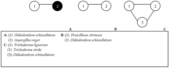 Complexes of soil organisms formed on zonal soil types. (A–C)—complexes of soil organisms formed on zonal soil types. The black circle is the dark-colored fungy species, the white circle is the light-colored fungy species.