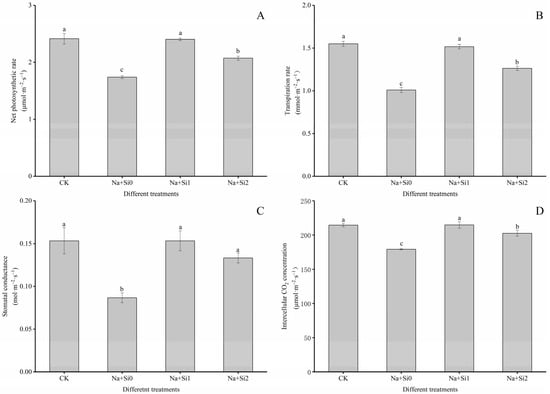Effects of exogenous silicon on leaf gas exchange indicators of P. ostii ‘Fengdan’ seedlings under salt stress. (A) Net photosynthetic rate; (B) Transpiration rate; (C) Stomatal conductance; (D) Intercellular CO2 concentration. Note: Data are presented as mean ± SD (n = 3). On each subgraph, different letters indicate significant differences at p < 0.05. Na + Si0, Na + Si1, Na + Si2, and CK refer to salt without silicon (200 mmol/L NaCl + 0 mmol/L K2SiO3), salt with low concentration of silicon (200 mmol/L NaCl + 0.75 mmol/L K2SiO3), salt with high concentration of silicon (200 mmol/L NaCl + 1.5 mmol/L K2SiO3), and without salt and silicon (control, CK), respectively.