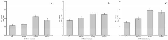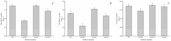 Effects of exogenous silicon on the assimilatory pigment content of P. ostii ‘Fengdan’ seedling leaves under salt stress. (A) Chlorophyll a content; (B) chlorophyll b content; (C) carotenoid content. Note: Data are presented as mean ± SD (n = 3). On each subgraph, different letters indicate significant differences at p < 0.05. Na + Si0, Na + Si1, Na + Si2, and CK refer to salt without silicon (200 mmol/L NaCl + 0 mmol/L K2SiO3), salt with a low concentration of silicon (200 mmol/L NaCl + 0.75 mmol/L K2SiO3), salt with a high concentration of silicon (200 mmol/L NaCl + 1.5 mmol/L K2SiO3), and without salt and silicon (control, CK), respectively.