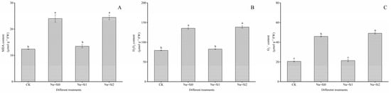 Effects of exogenous silicon on lipid peroxidation of P. ostii ‘Fengdan’ seedlings under salt stress. (A) MDA content; (B) H2O2 content; (C) O2− content. Note: Data are presented as mean ± SD (n = 3). On each subgraph, different letters indicate significant differences at p < 0.05. Na + Si0, Na + Si1, Na + Si2, and CK refer to salt without silicon (200 mmol/L NaCl + 0 mmol/L K2SiO3), salt with a low concentration of silicon (200 mmol/L NaCl + 0.75 mmol/L K2SiO3), salt with a high concentration of silicon (200 mmol/L NaCl + 1.5 mmol/L K2SiO3), and without salt and silicon (control, CK), respectively.