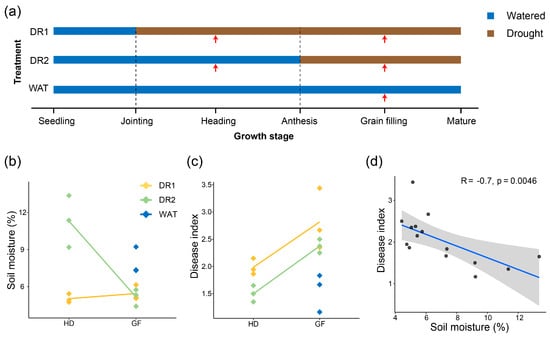 Effect of different watering regimes on the severity of wheat crown rot. (a) Schematic representation of three watering patterns. The dotted line indicates the stage of drought onset and the red arrow indicates the sampling time. (b) Differences in soil water capacity among treatments. (c) Differences in disease index among treatments. (d) Correlation between water capacity and disease index across all samples. HD: heading, GF: grain filling. DR1: early-drought pattern, DR2: late-drought pattern, WAT: well-watered pattern. The disease index in (c,d) was cited from unpublished data from Gao et al.