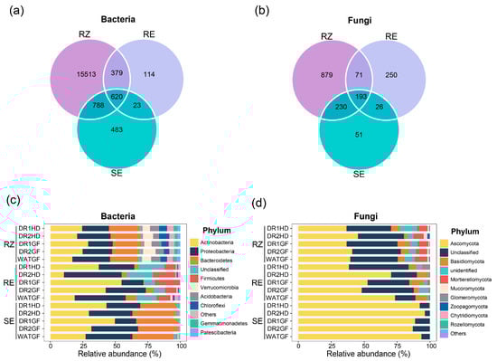 Differences in microbial community composition between compartments, watering patterns, and development periods. OTU distribution of bacteria (a) and fungi (b) among rhizosphere, root, and stem. Relative abundance of the microbial community under different watering regimes at phylum level of bacteria (c) and fungi (d). RZ: rhizosphere soil, RE: root, SE: stem. DR1HD: heading of early-drought pattern, DR2HD: heading of late-drought pattern, DR1GF: grain filling of early-drought pattern, DR2GF: grain filling of late-drought pattern, WATGF: grain filling of the well-watered pattern.