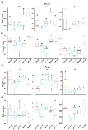 Effect of watering regimes on microbial alpha diversity. (a,b) Chao1 and Shannon index of bacterial community. (c,d) Chao1 and Shannon index of the fungal community. According to Duncan’s multiple means comparison tests, different lowercase letters indicate significant differences at p < 0.05. RZ: rhizosphere soil, RE: root, SE: stem. DR1HD: heading of early-drought pattern, DR2HD: heading of late-drought pattern, DR1GF: grain filling of early-drought pattern, DR2GF: grain filling of late-drought pattern, WATGF: grain filling of the well-watered pattern.