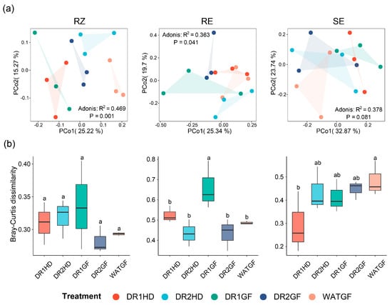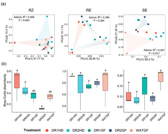 Distribution of the bacterial community among watering regimes in the rhizosphere, root, and stem. (a) PCoA was used to analyze the beta diversity of bacterial communities. (b) The dissimilarity of bacterial community structure based on Bray–Curtis distance. According to Duncan’s multiple means comparison tests, different lowercase letters indicate significant differences at p < 0.05. RZ: rhizosphere soil, RE: root, SE: stem. DR1HD: heading of early-drought pattern, DR2HD: heading of late-drought pattern, DR1GF: grain filling of early-drought pattern, DR2GF: grain filling of late-drought pattern, WATGF: grain filling of the well-watered pattern.