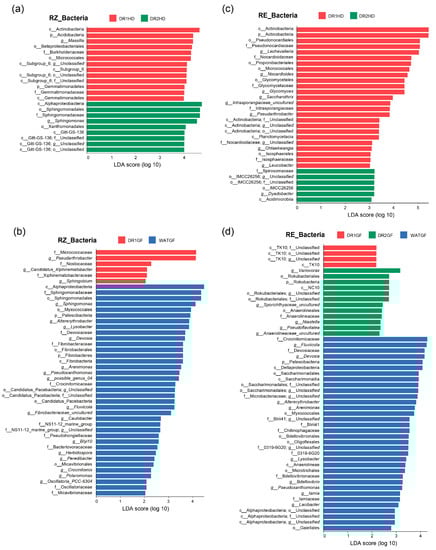 Bacterial biomarkers in rhizosphere and root under the different watering regimes. The linear discriminant analysis effect size (LEfSe) analysis showed the special biomarkers of the bacterial community in the rhizosphere (a,b) and root (c,d). The difference significance was confirmed using the Kruskal–Wallis test with p < 0.05. RZ: rhizosphere soil, RE: root. DR1HD: heading of early-drought pattern, DR2HD: heading of late-drought pattern, DR1GF: grain filling of early-drought pattern, DR2GF: grain filling of late-drought pattern, WATGF: grain filling of the well-watered pattern.