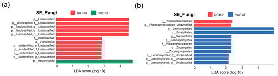 Fungal biomarkers in stem under the different watering regimes. The linear discriminant analysis effect size (LEfSe) analysis shows the special biomarkers of the fungal community in the stem (a,b). The difference significance was confirmed using the Kruskal–Wallis test with p < 0.05. SE: stem. DR1HD: heading of early-drought pattern, DR2HD: heading of late-drought pattern, DR1GF: grain filling of early-drought pattern, DR2GF: grain filling of late-drought pattern, WATGF: grain filling of the well-watered pattern.