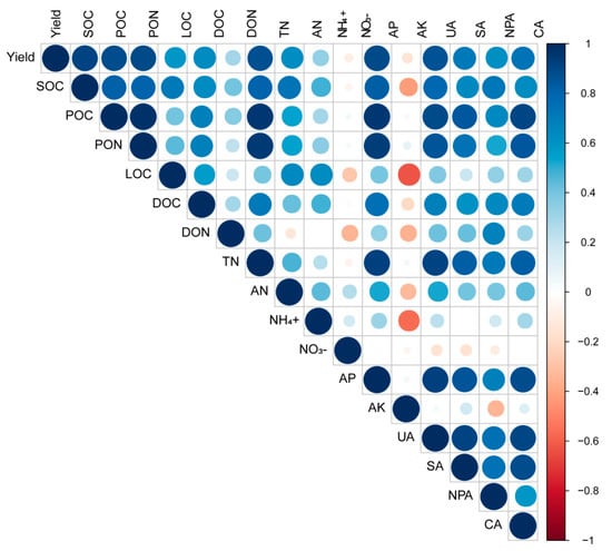 Heatmap showing correlations among all variables. All circles represent significant Spearman correlation coefficients (p < 0.05). SOC: soil organic carbon, POC: particulate organic carbon, PON: particulate organic nitrogen, LOC: labile organic carbon, DOC: dissolved organic carbon, DON: dissolved organic nitrogen, TN: total nitrogen, AN: alkaline-hydrolysis nitrogen, AP: available P, AK: available K, UA: urease activity, SA: sucrase activity, NPA: neutral phosphatase activity, CA: cellulase activity.