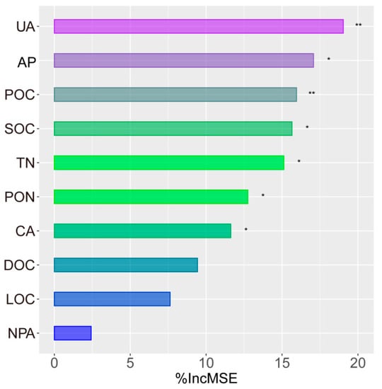 Prediction of yield responses to soil properties based on the random forest model (RFM). UA: urease activity, AP: available P, POC: particulate organic carbon, SOC: soil organic carbon, TN: total nitrogen, PON: particulate organic nitrogen, CA: cellulase activity, DOC: dissolved organic carbon, LOC: labile organic carbon, NPA: neutral phosphatase activity. * indicates p < 0.05, and ** indicates p < 0.01.