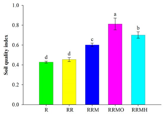 Mean values of soil quality index (SQI) based on the total data set (TDS) method. R: rice planted without fertilization, RR: rice–ryegrass rotation without fertilizer application, RRM: rice–ryegrass rotation with the application of mineral fertilizer, RRMO: rice–ryegrass rotation with the application of mineral fertilizer and organic manure, RRMH: rice–ryegrass rotation with mineral fertilizer and humic acid application. Different lower-case letters indicate significant differences at the 5% level. Vertical bars indicate the standard deviation of the mean.