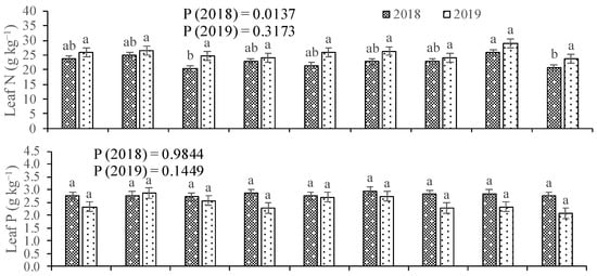 In 2018, significant differences were observed between treatments in N concentration in maize leaves (Figure 5). The control and the treatment corresponding to the application of 5 t ha−1 of biochar (B5) recorded the lowest average values (20.8 and 20.3 g kg−1, respectively) while the B2G8 treatment displayed the highest average value (25.9 g kg−1). In 2019, no significant differences between treatments were found in leaf N concentration and mean values ranged between 23.7 (C) and 29.1 (B2G8) g kg−1. Leaf P, K and Ca concentrations did not vary significantly between treatments in either of the two years of the study. In 2018 and 2019, the average levels of P in the leaves varied over the ranges of 2.7–3.0 g kg−1 and 2.1–2.9 g kg−1, respectively. Average K levels varied between 15.4–18.9 g kg−1 and 20.5–25.5 g kg−1 and Ca levels between 1.6–1.9 g kg−1 and 1.6–2.7 g kg−1. Leaf Mg levels varied significantly between treatments in 2019. In 2018 average values varied between 1.2–1.4 g kg−1. In 2019, the higher values (2.5 g kg−1) were found in the G5(-1) treatment and the lower ones (1.7 g kg−1) in the control. Leaf concentrations of the micronutrients B, Fe, Cu, Zn, and Mn were also determined in this study, but no significant differences between treatments or any consistent trends worth reporting were recorded, despite the extraordinarily high values of Fe in the biochar, 28.1 and 45.6 g kg−1 in 2018 and 2019 respectively; these are much higher values than any of the macronutrients (Table 2).