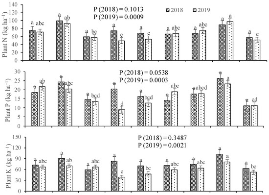 The amount of nutrients found in the aboveground biomass is a function of the biomass produced (grain and straw) and its nutrient concentration. The results of nutrient removal in maize aboveground biomass are shown in Figure 7. N removal in maize plants varied significantly between treatments only in 2019. However, the pattern of the differences observed between treatments was similar to that observed for grain (Figure 2) and total dry matter yield (Figure 3). The control showed very low annual N removal values, slightly higher than 50 kg ha−1, while in the B2G8 treatment, the average values were close to 100 kg ha−1.