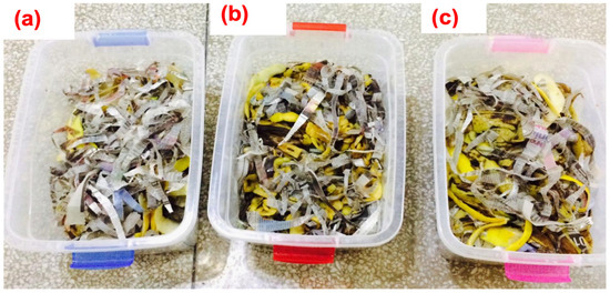 Food waste was vermicomposted in beds prepared in plastic bins. Each bed was filled with 1.5 kg of shredded newspaper, 0.5 kg of the substrate (food waste), 0.05 kg of garden waste, and approximately 100 adult earthworms; however, only 76 earthworms remained alive in the first basket. So, a total of 76 earthworms were used for the study in the case of a single type of worm (Figure 1a,c), and in the combined case, 38 Eisenia fetida worms and 38 Lumbricus rubellus worms were used for uniformity of data (Figure 1b). The worms were introduced into the compost beds to begin the process of vermicomposting (Figure 2). The moisture level of the beds was maintained at about 45–70% [38] during the vermicomposting period by periodically sprinkling them with water through water sprays. The compost was periodically analyzed in the laboratory for moisture content (MC), pH, temperature, organic content (C), C/N, and total Kjeldahl nitrogen (TKN). The containers were supplied with small holes in the top lid to ensure aerobic conditions.