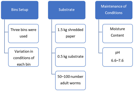Composting requires the presence of two types of materials: nitrogenous and carbonaceous. The proportion of nitrogenous or carbonaceous material depends on the quality of the required compost. A carbonaceous/nitrogenous (C/N) ratio of 30 can be an optimized ratio for vermicomposting [37]. Kitchen waste, collected from cafeterias and consisting of vegetable and fruit peelings that were rich in nitrogen, was combined with a portion of garden waste and shredded paper waste to make up the carbon content. Before vermicomposting, the collected samples were partially decomposed by keeping them in shade for almost 2 weeks. Furthermore, the initial C/N ratio of 30 was controlled by blending the optimum amount of cow dung (248 g) and additional saw dust and garden waste (12 g) with the partially decomposed waste. Worms were collected from the rear of a facility of the University of Engineering and Technology, Lahore. Two types of worms, i.e., Eisenia fetida (EF) and Lumbricus rubellus (LR), and a combination of these two, were used for the study. They were introduced into the bins for the initiation of composting (Figure 1). The volume of the bin was 0.15 m3, i.e., (height × length × width) (0.75 m × 0.5 m × 0.4 m).