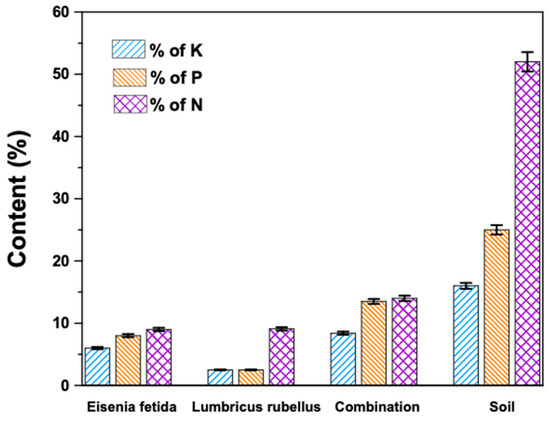 Figure 4 indicates that the nitrogen content was also the highest in the combination process compared to the other two vermicomposting processes, as the nitrogen percentage present in the EF compost was 9 ± 0.23% and 9.1 ± 0.27% in the LR compost. The combination compost of EF–LR had a nitrogen ratio of 14 ± 0.42%. The soil had a nitrogen percentage of 52 ± 1.50%. These results suggested that macronutrients are already present in plenty in fertile soils and in composts. This can also be attributed to nutrient-rich kitchen waste, as it already contains fruits and vegetables that are rich in nutrients [43].