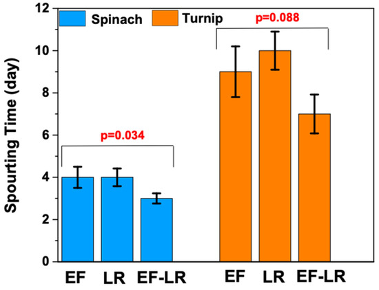 The results shown in Figure 5 give the sprouting time for spinach. In the case of EF and LR, the compost was 4 ± 0.50 days individually, and the EF–LR compost was 3 ± 0.24 days. Similarly, the sprouting time of turnips for EF–LR was also lower (7 ± 0.92 days) compared to the EF and LR composts, which had 9 ± 1.2 and 10 ± 0.92 days of sprouting time, respectively. Vermicompost acts as a bio-oxidative, so it may release compounds that help crop sprouting and growth. Thus, the EF–LR compost was more bio-oxidative in nature, showing a shorter sprouting time for both crops [44]. In general, the statistical analysis of the results shows that variation of the sprouting time of the spinach in all three composts was significantly different, as p < 0.05, which shows the difference in sprouting times for spinach. However, no significant difference was observed in the case of the turnip, as p > 0.05. It might be due to a non-significant impact of the compost in the sprouting time of the turnip. In addition to that, the overall sprouting time of the combined compost was shorter, and we concluded that seeds exposed to the combined compost could be expected to reach harvest earlier.