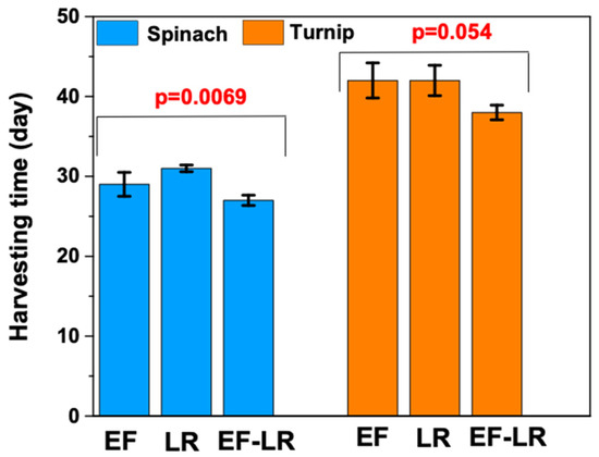 Harvesting time was also found to be faster in the case of compost from the combination of worms for both spinach and turnips (Figure 6). The results show that in the case of the EF compost, the harvesting times for spinach and turnips were 29 ± 1.5 and 42 ± 2.2 days, respectively. However, for the LR and EF–LR composts, the harvesting times of spinach and turnips were 31 ± 0.42 and 42 ± 1.9 days, and 27 ± 0.64 and 38 ± 0.92 days, respectively. Generally, compost with good nutrients and optimal chemical composition results in a shorter harvest time for the crop and good plant size [45]. Similar to the sprouting time, statistical analysis of the harvesting time also shows no significant difference for the turnip harvesting under three different composts. Moreover, the spinach shows significantly different results, and we concluded that variation in compost type has significant impact on the harvesting time of spinach. However, in general, EF–LR compost has a shorter harvesting time in both cases. These results show a good correlation between the nutrient levels in the combined process compared to the EF and LR composts alone. Hence, it may be suggested that nutrient-rich compost may help in the reduction of harvesting time [45].