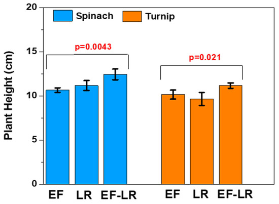 Plant height may be another important indicator to judge the quality of a compost. The results shown in Figure 7 indicate that the EF–LR compost had better results, and the plant height for both spinach and turnips was higher than for the EF and LR composts alone. Figure 7 shows that the heights of the spinach and turnip plants were 4.2 ± 0.1 and 4 ± 0.2 inches in the case of the EF compost, in comparison to the EF–LR-compost-grown plants, which were 4.9 ± 0.24 and 4.4 ± 0.12 inches, respectively. Moreover, the LR-compost-grown plants were shorter compared to the EF–LR-compost-grown plants, as illustrated in Figure 7. The height was 4.4 ± 0.22 inches for the LR compost. Moreover, statistical results also confirmed that for both plants’ height, spinach and turnip harvested in the three compost conditions show significant difference (p < 0.05). Overall, the combined EF–LR harvested plants have higher plant height compared to the individual harvested plants in both cases. As for genetic structure, plant height is a significant component contributing to plant yield. By using vermicompost, the physical and chemical properties of the soil can be enhanced, which can eventually boost plant height and yield [46].