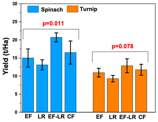 Figure 8 indicates that the yield of turnips in the case of EF compost was 10.95 ± 1.2 t/Ha. The yield of the LR compost was 9.29 ± 0.9 t/Ha. The EF–LR compost yield was 12.86 ± 1.92 t/Ha. In the case of chemical fertilizers, the yield was 11.75 ± 1.5 t/Ha. These results verify that the EF–LR compost used for the turnip plants had a higher yield not only in comparison to the EF and LR composts but also to chemical fertilizer used for crop harvesting. Moreover, statistical analysis results show that the yields of spinach have significantly different outcomes as compared to the turnip in similar exposed conditions. The EF–LR compost has a higher plant yield in the case of spinach and is significantly verified as p < 0.05, which shows the difference in results. However, in the case of turnips, the EF–LR compost shows a higher yield, but in comparative evaluation, the difference is not significant, as p > 0.05.