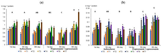 The present study indicated a diversified impact of humic and nitrophenolic biostimulators combined with pesticides on the activities of the following antioxidant enzymes in wheat leaves: catalase (CAT), NADH-dependent peroxidase (POD), and superoxide dismutase (SOD) (Figure 2). After the application of the sulfosulfuron and humic or nitrophenolic biostimulators, the enhanced activity of CAT in inoculated plants was determined (up to 1.22 U mg−1 protein on day 5, for T7). Non-inoculated treatments with sulfosulfuron and biostimulators (T4, T6) had a lower CAT activity; generally, however, enhanced POD (up to 0.107 U mg−1 protein for T6) and SOD (up to 31.09 U mg−1 protein for T6) levels were found when compared to the inoculated treatments that were conducted with sulfosulfuron and biostimulators (T5, T7). Notably, the application of propiconazole + cyproconazole (T2–T7) generally caused intensified activities of POD and SOD compared to the treatments conducted with sulfosulfuron (Figure 2). Nitrophenols combined with fungicides caused enhanced activity of CAT in inoculated wheat on day 8 (1.64 U mg−1 protein). The POD and SOD levels were significantly lower in inoculated plants (T3, T5, T7) when compared to the non-inoculated wheat (T2, T4, T6). In contrast to the treatment with propiconazole + cyproconazole only (T2), supplementation with biostimulators (T4, T6) induced POD activity, which was most efficient in the case of humic acids on day 8 (0.129 U mg−1 protein). After the application of fungicides, SOD activity was the highest on day 1 (T2, 43.73 U mg−1 protein) (Figure 2).