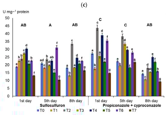 Antioxidant enzyme activities in wheat leaves under the influence of diversified treatments. (a) Catalase; (b) NADH—dependent peroxidase; (c) Superoxide dismutase. T0—control; T1—F. culmorum; T2—herbicide/fungicide 1; T3—herbicide/fungicide 1 + F. culmorum; T4—herbicide/fungicide 1 + humic acids; T5—herbicide/fungicide 1 + humic acids + F. culmorum; T6—herbicide/fungicide 1 + nitrophenols; and T7—herbicide/fungicide 1 + nitrophenols + F. culmorum. The vertical lines in each bar indicate the standard deviation (n = 3). The same lowercase letter indicates no statistically significant differences between treatments (p ≥ 0.05). The same uppercase letter indicates no statistically significant differences between pesticide concentrations (time of dissipation), determined with ANOVA followed by Fisher’s test.