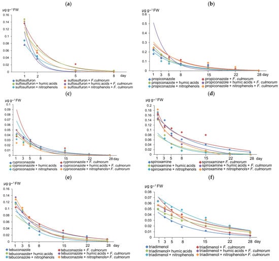 Dissipation kinetics of the pesticides in wheat plants (a) sulfosulfuron; (b) propiconazole; (c) cyproconazole; (d) spiroxamine; € tebuconazole; (f) triadimenol.