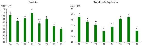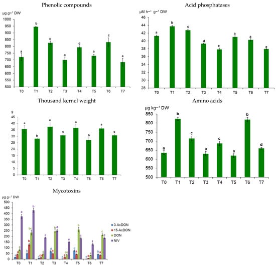 Wheat metabolites, thousand kernel weight, and mycotoxins in the grain under the influence of diversified treatments. T0—control; T1—F. culmorum; T2—herbicide + fungicide 1 + fungicide 2; T3—herbicide + fungicide 1 + fungicide 2 + F. culmorum; T4—herbicide + fungicide 1 + fungicide 2 + humic acids; T5—herbicide + fungicide 1 + fungicide 2 + humic acids + F. culmorum; T6—herbicide + fungicide 1 + fungicide 2 + nitrophenols; and T7—herbicide + fungicide 1 + fungicide 2 + nitrophenols + F. culmorum. The vertical lines in each bar indicate the standard deviation (n = 3). The same letter indicates that there were no statistically significant differences between the treatments (p ≥ 0.05), determined with ANOVA followed by Fisher’s test.