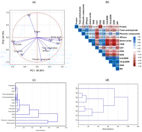 (a) The principal component analysis (PCA) of the influence of humic acids and nitrophenols combined with pesticides and fungi on the examined parameters in wheat. (b) Pearson’s correlation coefficients visualized as a heatmap. (c) Clustering of the examined parameters obtained from treatments T0–T7. (d) Hierarchical clustering diagrams, based on all examined parameters, defining the similarity level between treatments.